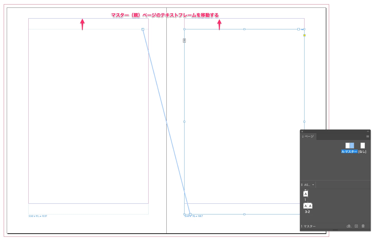 そうしたら、マスター(親)ページのテキストフレームの位置を調整します(分かりやすいようにレイアウトグリッドを非表示にしてテキスト連結を表示させています)。
