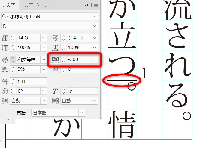 気になるのであれば選択した状態でトラッキング(私の場合-300でした。フォントや文字サイズで変わるかもしれません)をかけてやれば文字が入ってきます。