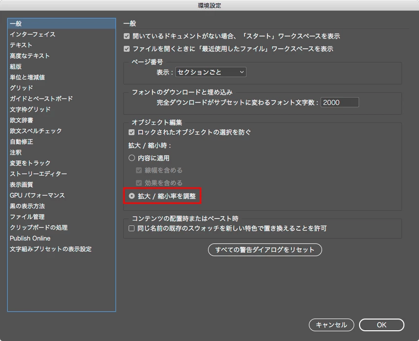 [拡大/縮小 Xパーセント]を変更後に、その変更した値を表示させておきたい場合には、環境設定の[一般]で「拡大/縮小率を調整」をオンにします。