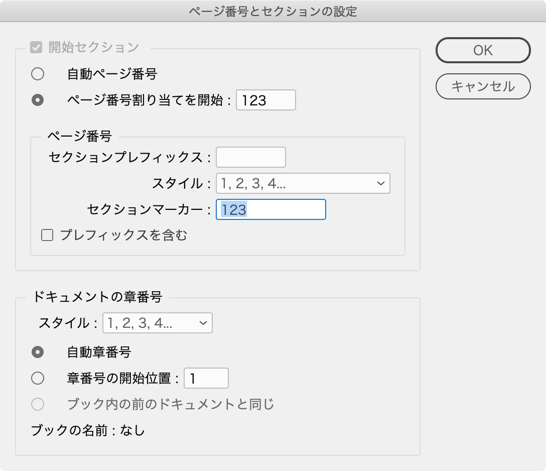 テキスト変数に使用するので、このページ番号専用にする(例では「開始ページ」)。文字色は「なし」に設定しておけば、ページ内にテキストフレームを置くことができます