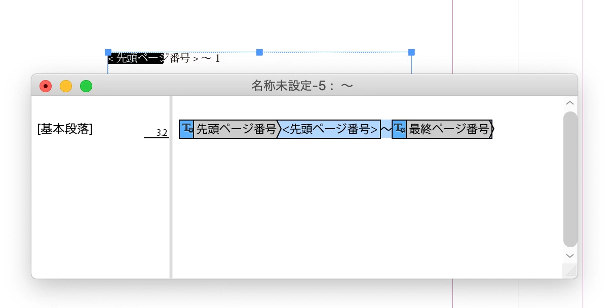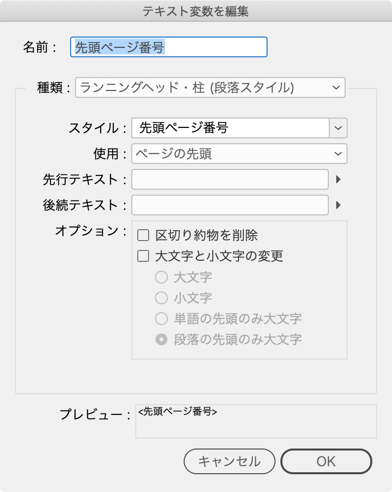 「ランニングヘッド・柱(段落スタイル)」で「開始ページ」スタイルを指定。変数名は「開始ページ」に