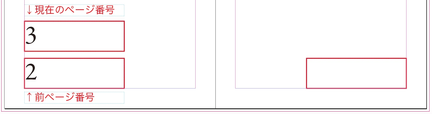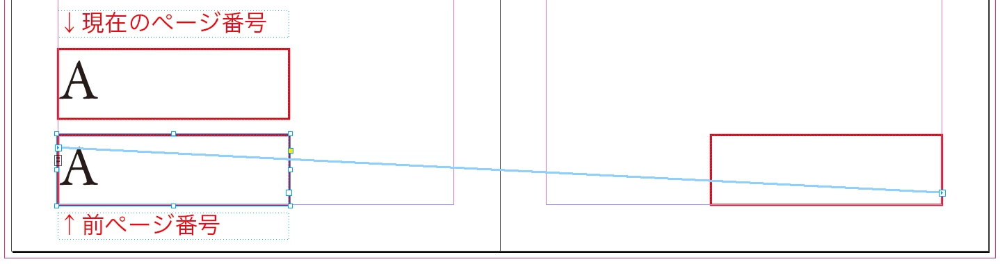 まず、左右のテキストフレームを片ページに寄せてしまうと、そもそも前ページ番号を使う意味がなくなってしまう(同じノンブルになる)ので、やってはいけません。
