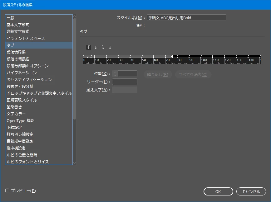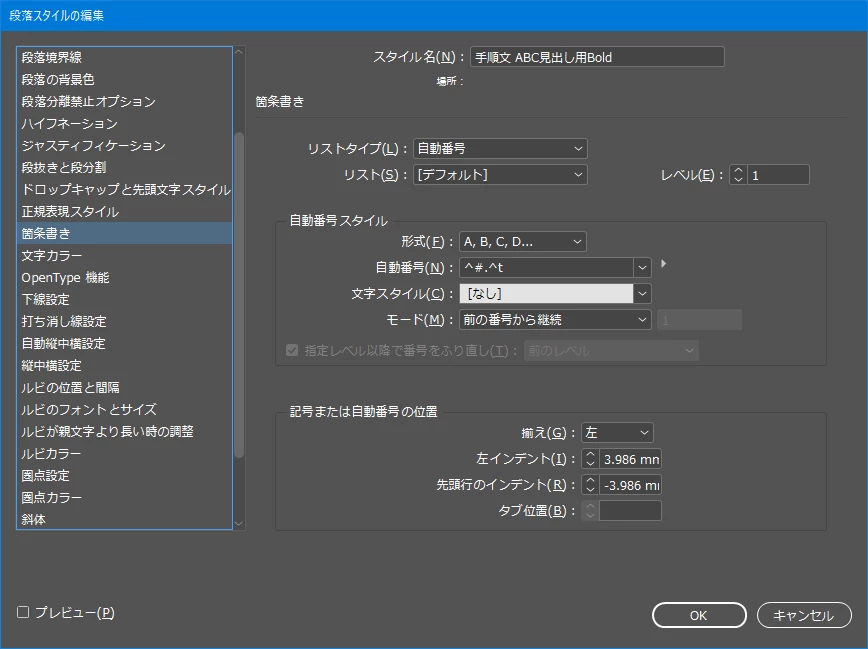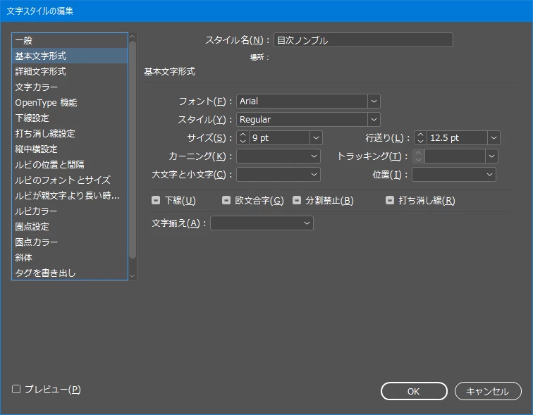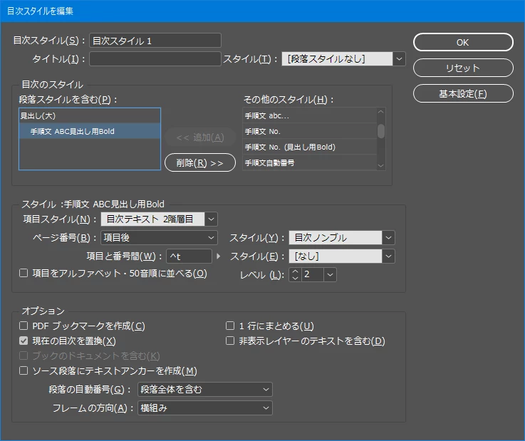 目次・・・[目次スタイルを編集]の設定項目のうち関係しそうな項目の設定内容は以下のとおりです。