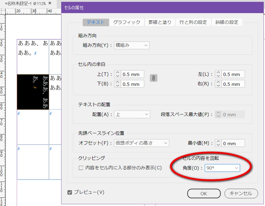 335420579Participating FrequentlyForum|Forum|2 years agoOctober 19, 2023解決済み縦書の表のセル内で横倒しはできますか?Forum|Forum|2 years agoOctober 19, 2023返信数 1.344 ビュー縦書の表のセル内で文書の横倒しはどのようにしたらよいのでしょうか(添付画像1)回転かと思ったのですが読点の向きがどうにもうまくいきませんでした。横書きのテキストフレームをインラインで入れるのも考えましたが数が多いためできれば避けたいです。理想はWordの「縦書きと横書き」機能の「文字の向き」です(添付画像2赤枠)よろしくお願いいたします。
