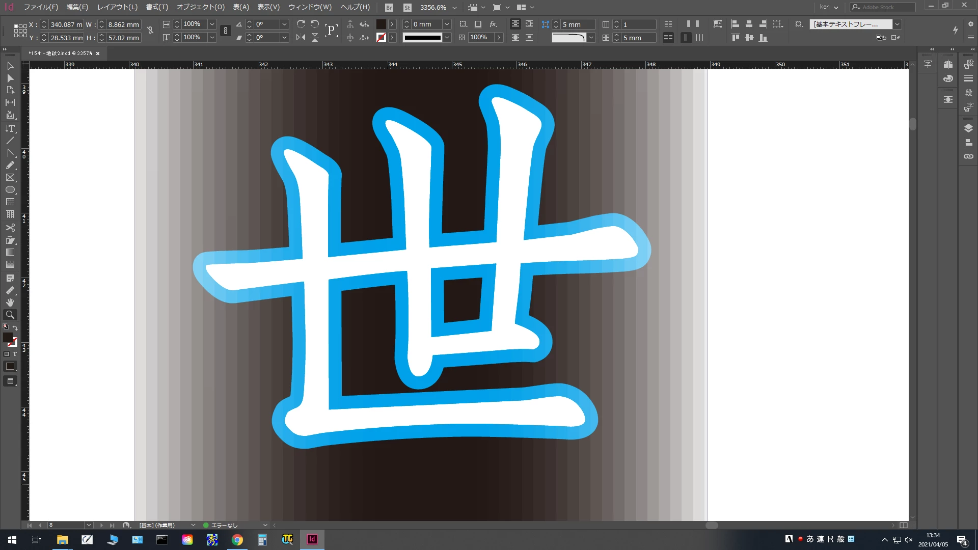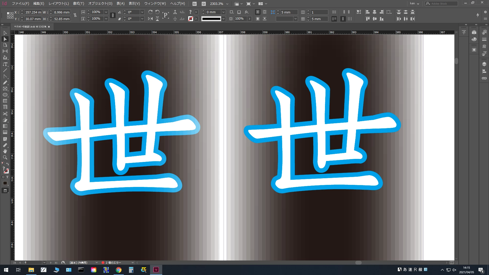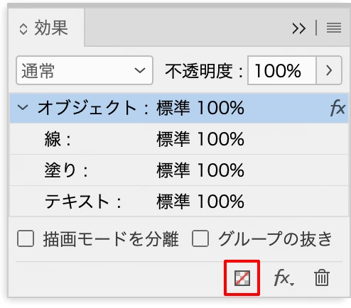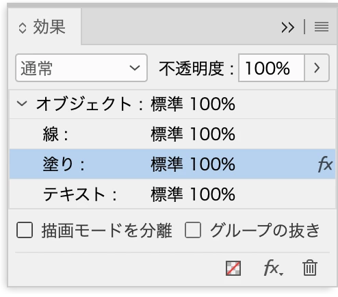 こちらはテキストフレームに塗りを設定し、透明パネルの「塗り」をクリックして選択後、パネル右下の「fx」のアイコンをクリックして効果(グラデーションぼかし)を設定しています。