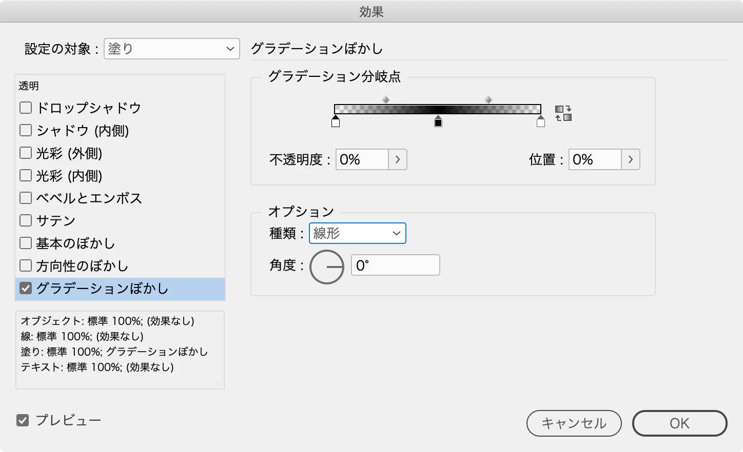 「グラデーションぼかし」の設定は、グラデーションと同じ要領でストップカラーを追加し、両端の不透明度を0%に設定しています。