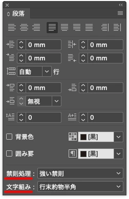 (Mojikumi: line end all 1/2 em; Kinsoku: Hard Kinsoku).
