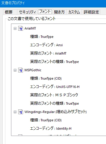 PDFをAcrobatの文書のプロパティで確認するとヘッダーとフッターの文字は、埋め込みサブセットにならないようです。
