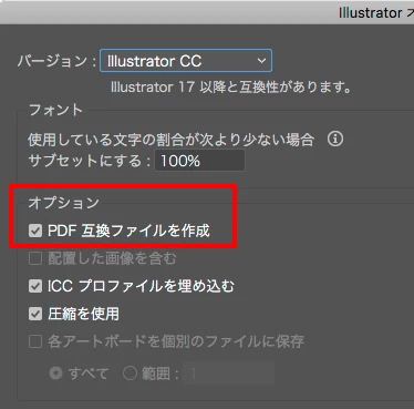 .aiをInDesignへ配置するには「PDF互換ファイルを作成」をONにするわけです。そうすると、