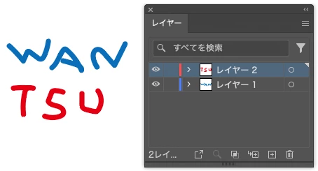 1. aiドキュメントを2種作成。レイヤー名はひとまず共通(デフォルトのまま)とし、レイヤー2つの「12.ai」とレイヤー3つ以上の「1234.ai」を保存した。