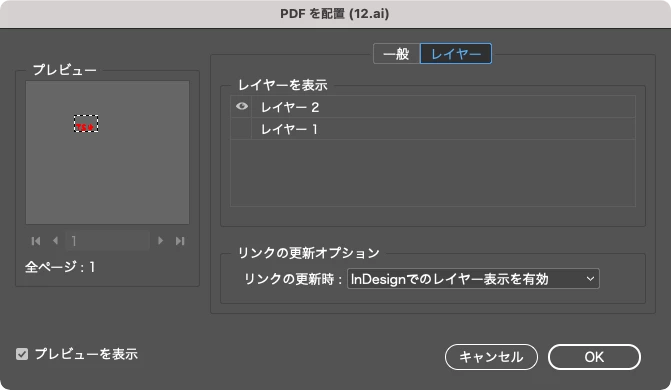 4. 上記手順のうち、2. の「12.ai」を配置する際、読み込みオプションで「レイヤー 1」を非表示にしてみた。