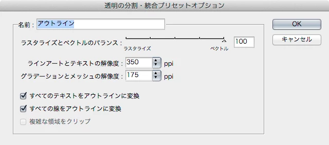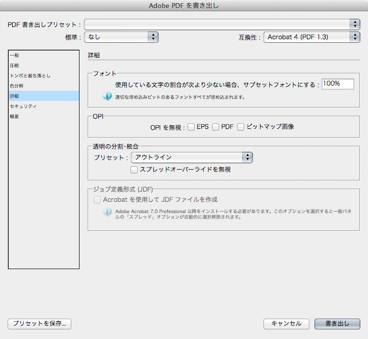 安全のため、書き出しプリセットは印刷会社に入稿する場合の設定をベースに変更を行い、校正時も入稿時も同じ設定を使用してください。
