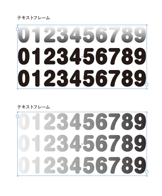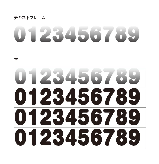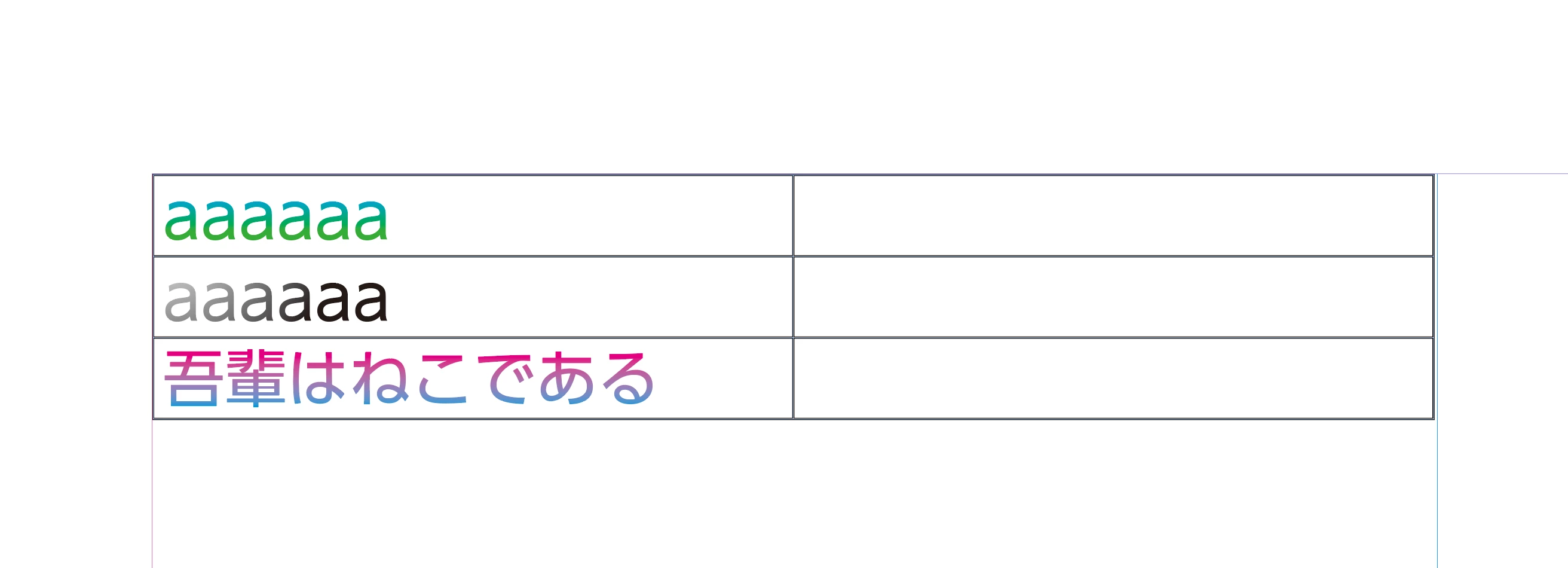 表内の文字を選択し、アピアランスの「塗り」からグラデーションを設定しています。すると、表内の文字ではグラデーションで設定したうちの一色だけで塗りつぶされてしまうことが大半です。ただし、例えば黒を94%の位置に、白を96%の位置に、角度を90度にすると、文字のちょうど真ん中あたりにグラデーションの境目が来ることもあります。ところが、他の文字でも同じように設定しようとしたらまた一色に塗りつぶされてしまいました。他の通常の本文にはグラデーションが適用できました。