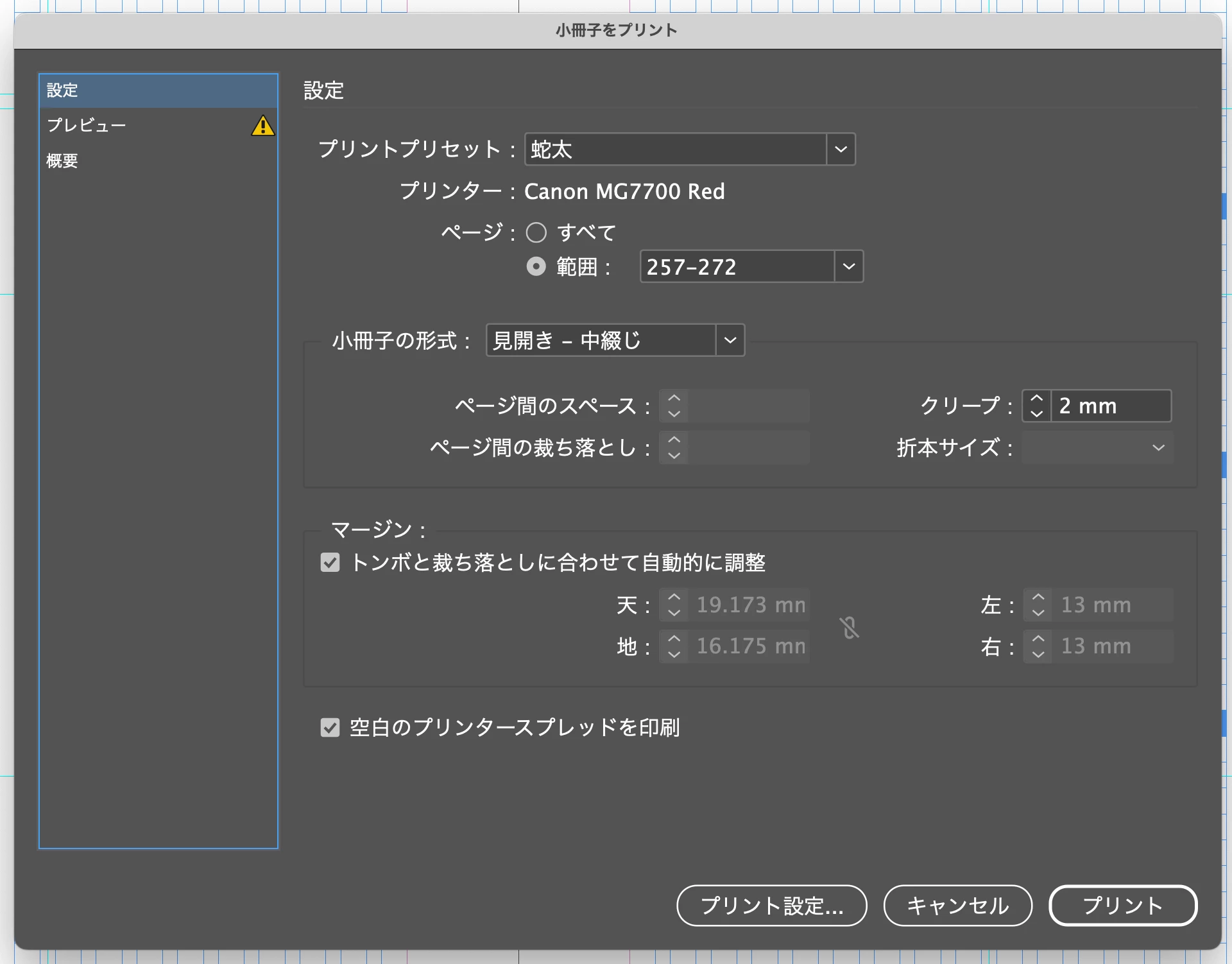 16ページごとに小冊子をプリント>プリントプリセットを確認>範囲を指定>プリント設定>プリントプリセットを選ぶ>OK>プリントと指定しているので