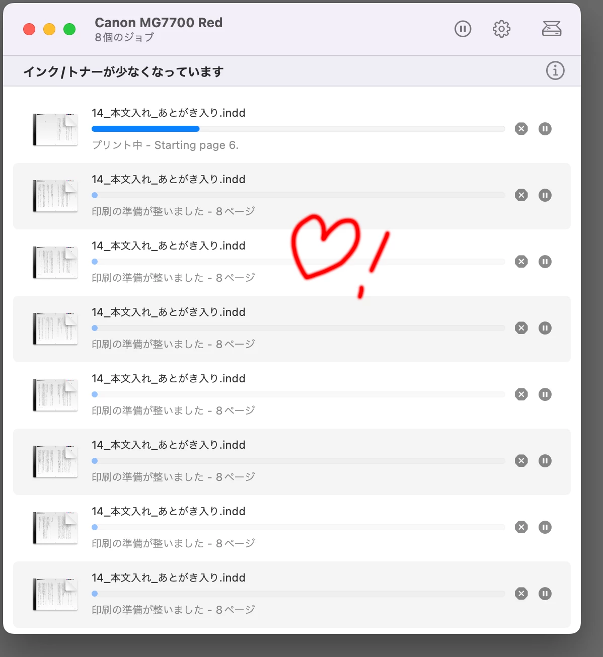 多ページの組版データを小冊子印刷をして、16ページごとに中綴じの設定でプリントアウトし、手製本をしています。