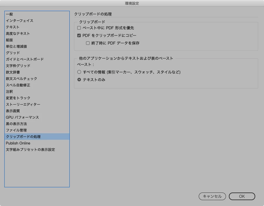 Illustratorからスタイル情報を保持してInDesignにコピー&ペーストしたいのですが、過去バージョンアップにあった環境設定→一般「ペースト中にテキストの属性を保持」という項目が見当たりません。