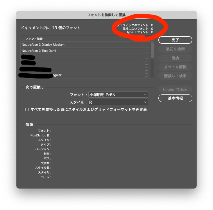 hikoalaParticipantForum|Forum|4 years agoSeptember 8, 2021Questionindesign 2021 でPDFXに書きだす際にフォントエラーのメッセージがでますForum|Forum|4 years agoSeptember 8, 20212 replies3461 viewsBigsurでindesign2021を使用して作成したデータがあります。ここ何年か年ごとにアップデートしているデータです。合成フォントも3種類ほど使っており、すべてライブラリ内に確認しています。 。。。なのですがPDF-Xで書き出そうすると、添付のメッセージが現れます。フォントを検索してもデータ内には何も足りないものはないようです。PDF-Xは、最初のメッセージの後OKすれば書き出せるのですが、このまま入稿するのは心配です。 何か対処法をご存知の方がいらしたらご教授ください。よろしくお願いいたします。 読み込みと書き出し