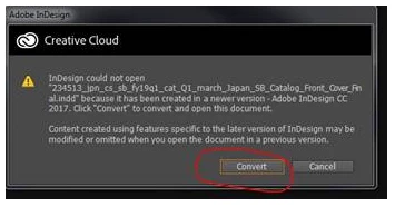 同じファイルを日本で開くと [convert] ボタンが表示されず、CC2014以上で開いてからIDMLへ下位保存しないとCC2014で作業できません。
