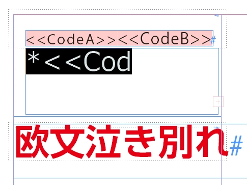 そのため回避策としては、フィールドの文字を1文字でも表示させればよい、ということです。つまり「<<CodeB>>」の先頭の「<」だけでも見えるようにしておけばよいです。そのために使うのが「欧文文字泣き別れ」です。