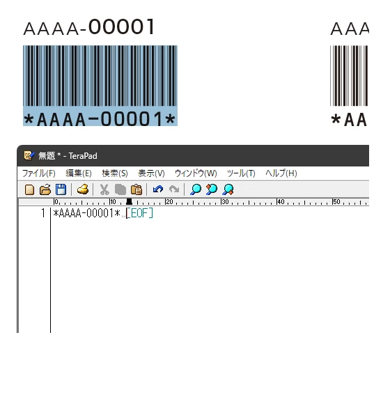 バーコード部分のフォントをメイリオに置き換えたものを添付しましたので、よろしければこちらでご確認下さい。