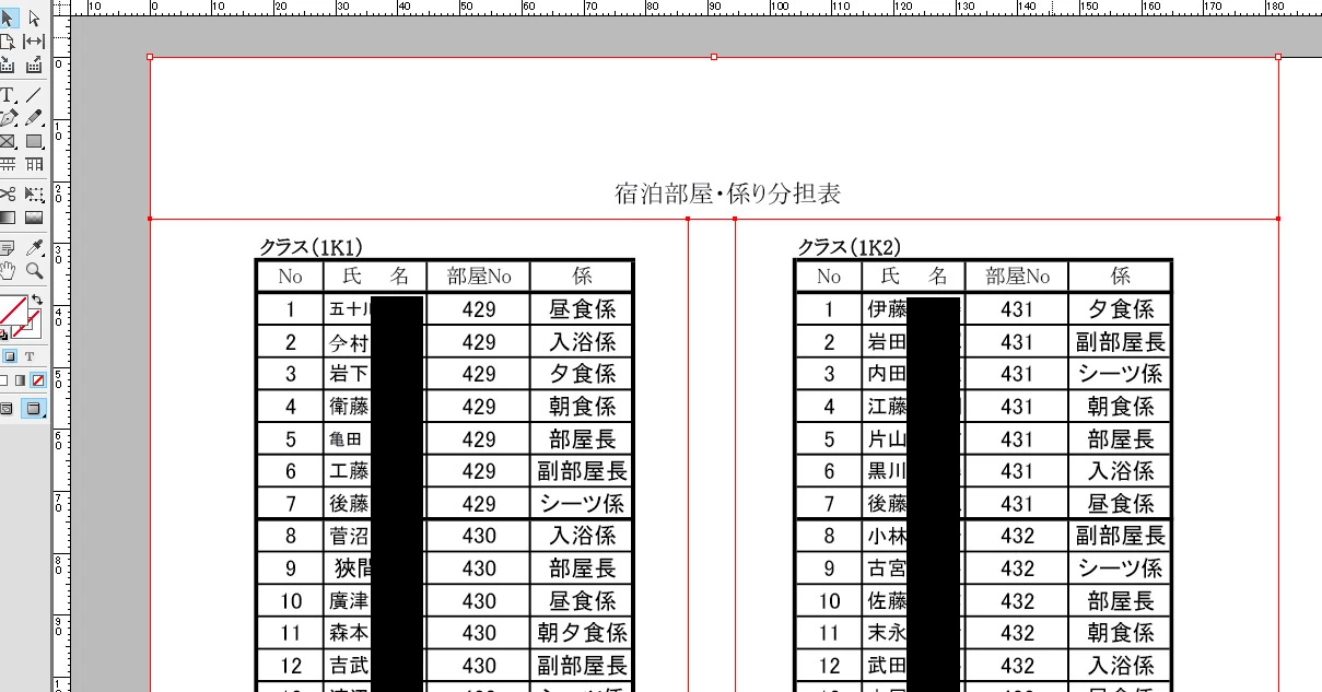 A4に縦2段の表ですが、インデザイン上で2つの表の間隔を調整したかったので、表を左右個別に配置し調整。