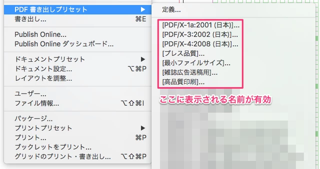 入力するプリセット名は、ファイルメニュー>PDF書き出しプリセット から一覧で表示されるものを正確に入力する必要があります。
