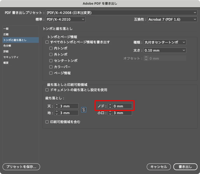 片側1ページの小口からノドまで画像を貼り付けPDF書き出しをした際、