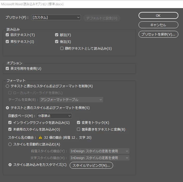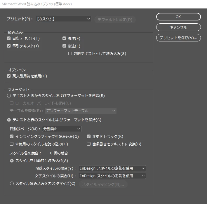 Wordで作成した文章を配置を使い、スタイルを読み込む設定でインデザインに流し込んでいるのですが、スタイルが正しく読み込まれず、文章全体が「スタイルなし」のオーバーライドになってしまいます。
