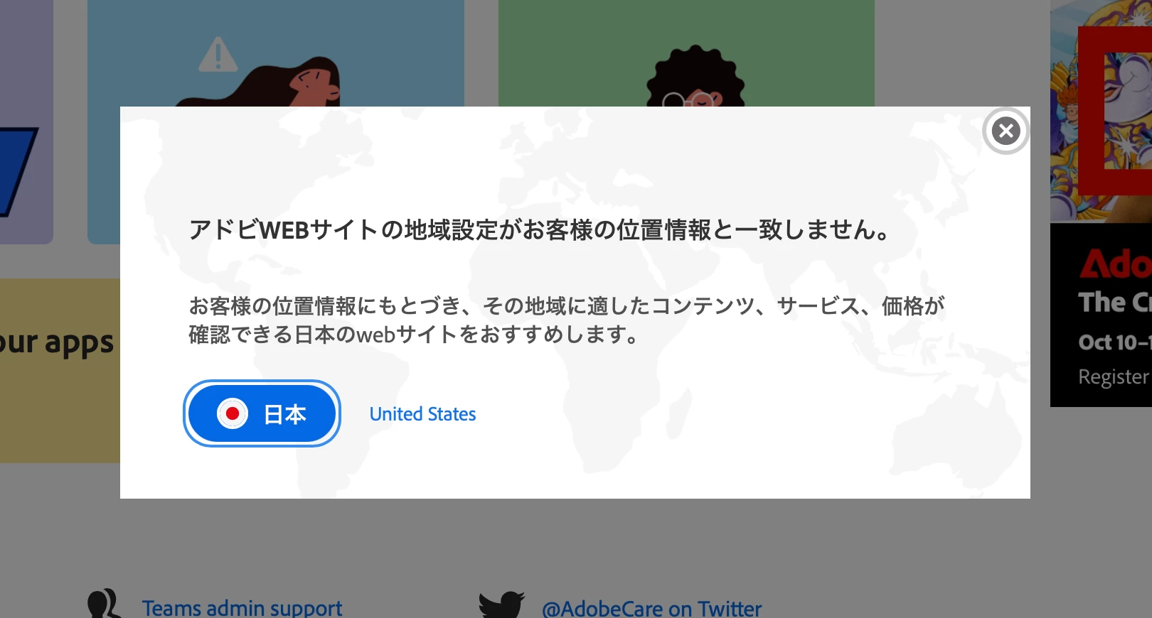 アドビwebサイトの地域設定がお客様の位置情報と一致しません。と出ます