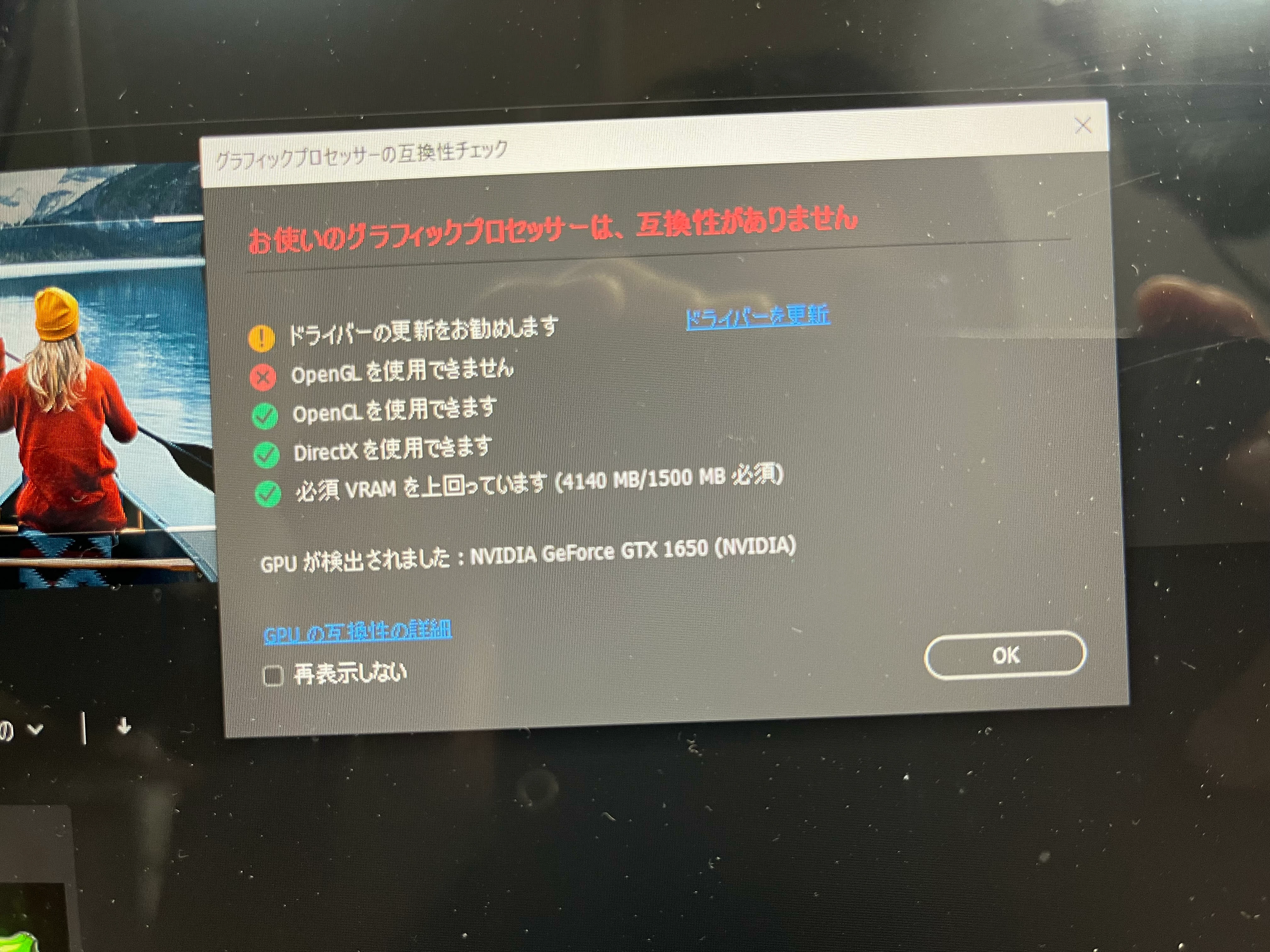 - NVIDIAのサイトからダウンロードした際には、スタジオドライバーはAdobeでは利用出来ない形になっているようです。ゲームレディードライバで動作させるとダイレクトXに対応したOPEN GLがINTELのほうから出力されるようです。対応しているOPEN GLは4.6のようです。