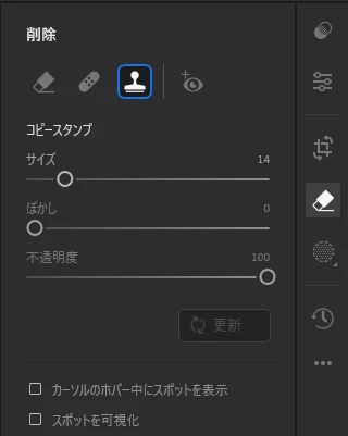 削除ツールのアイコン(右下に▲があるやつ)をタップすると、削除、修復、コピースタンプが選べるようになっています。