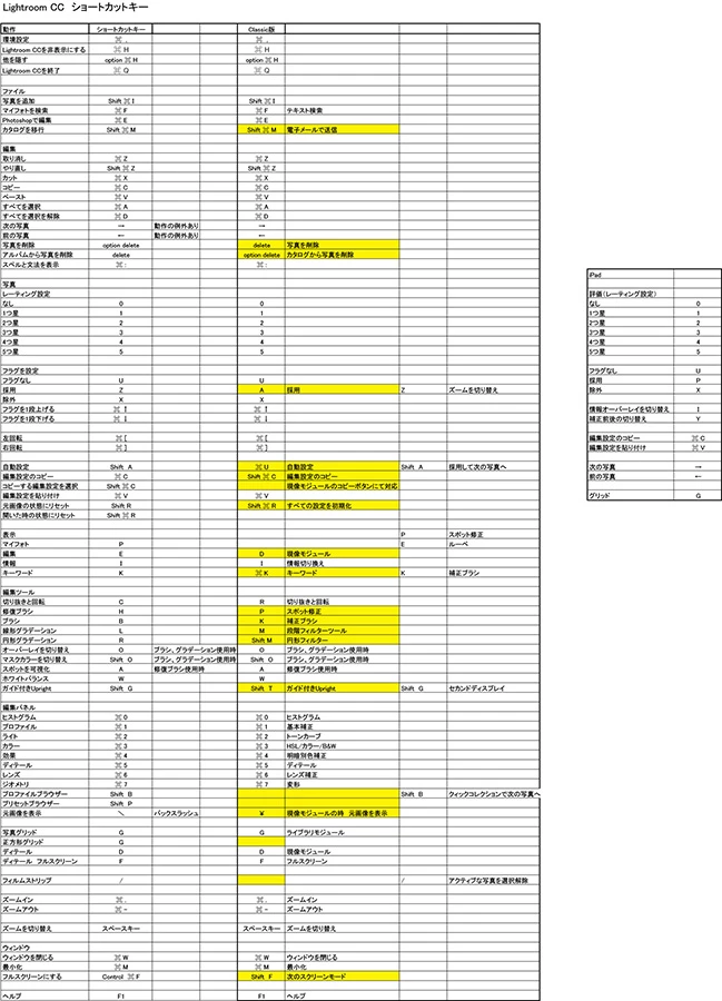 Lightroom Classic CCにはショートカットキー一覧が用意されていますが、Lightroom CCにはそのようなものがないようです。