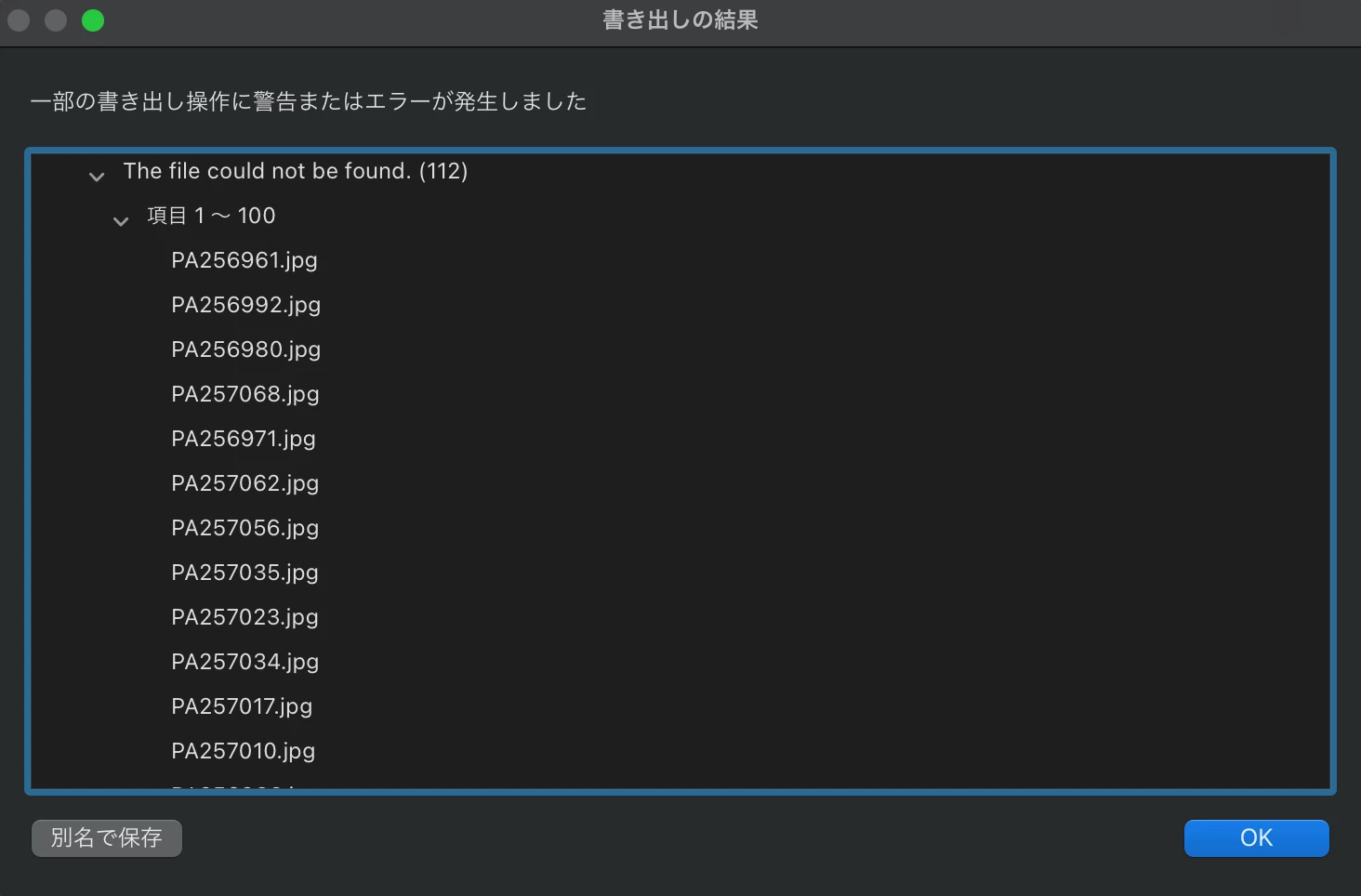 Ttakahisa.kParticipantForum|Forum|3 years agoNovember 4, 2022Question纏めて多数を書き出しする際に時にエラー発生Forum|Forum|3 years agoNovember 4, 20222 replies1809 viewsPCから纏めて書き出しする際に、いつも下記エラーが発生してとても困っています。 ”Lightroom 一部の書き出し操作に警告またはエラーが発生しました”12枚以上をローカルに書き出しする際にいつも表示されるため非常に困っています。何か対処する方法があったら教えてください。今まで撮影した写真を何百枚も一度に書き出し出来ていたのに、現在細かく区切って書き出しせざるを得なくなってしまい、その結果書き出し作業に膨大な時間を費やしてしまってます問題またはエラー