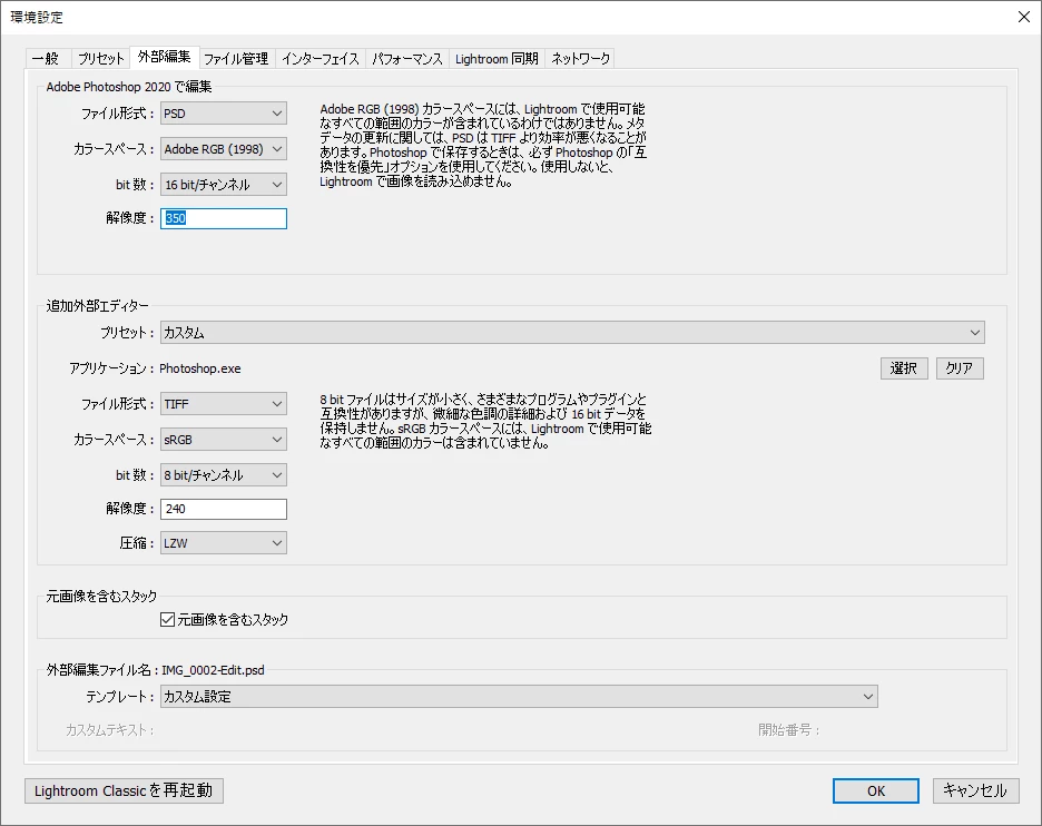 環境設定を開き、外部編集・Adobe Photoshop 2020で編集の「解像度」部分の数値を変更することで対応できます。