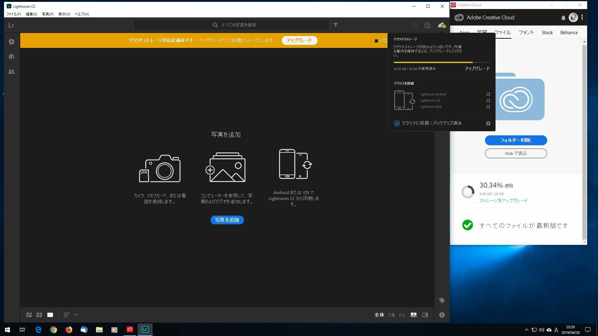 Lightroomを立ち上げると「クラウドスペースがほぼいっぱいです」というメッセージが出ましたので