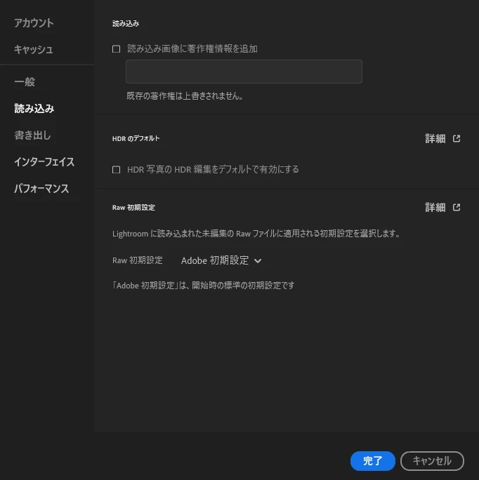これでホーム画面と「ファイル」メニューの「最近使用したファイル」リストが完全に非表示になります。設定変更後はLightroomの再起動が必要です。