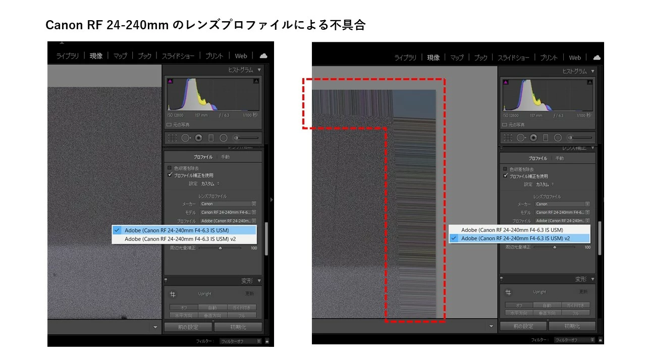 Canon RF 24-240mmのレンズプロファイルはドロップダウンリストで2種類あり(無印とV2)。