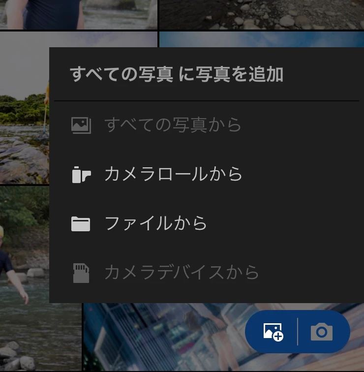 以前、写真を取り込む際に画面右下のプラスボタンを押すと、カメラデバイスが選択できたのですが、現状選択できないようになってます。