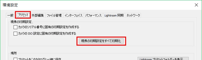 推定で申し訳ありませんが、前者の場合は、メニューの「編集」→「環境設定」を選択し、開いた「環境設定」ウィンドウで「プリセット」タブを選択し、「現像の初期設定をすべて初期化」をクリックし、続いて「OKを」クリックします(下図赤枠部)。