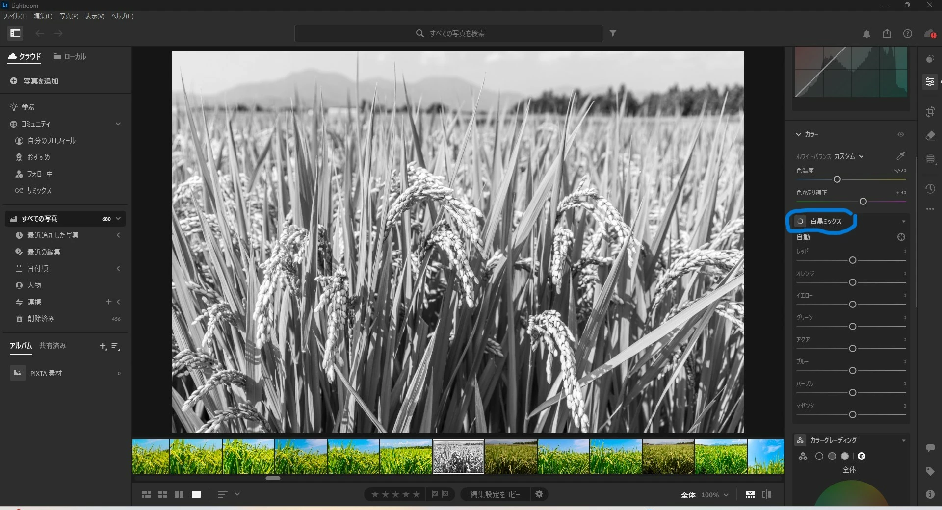 モノクロ以外のカラープロファイルに変更するか、写真/編集のリセットを選択すると初期化されます。