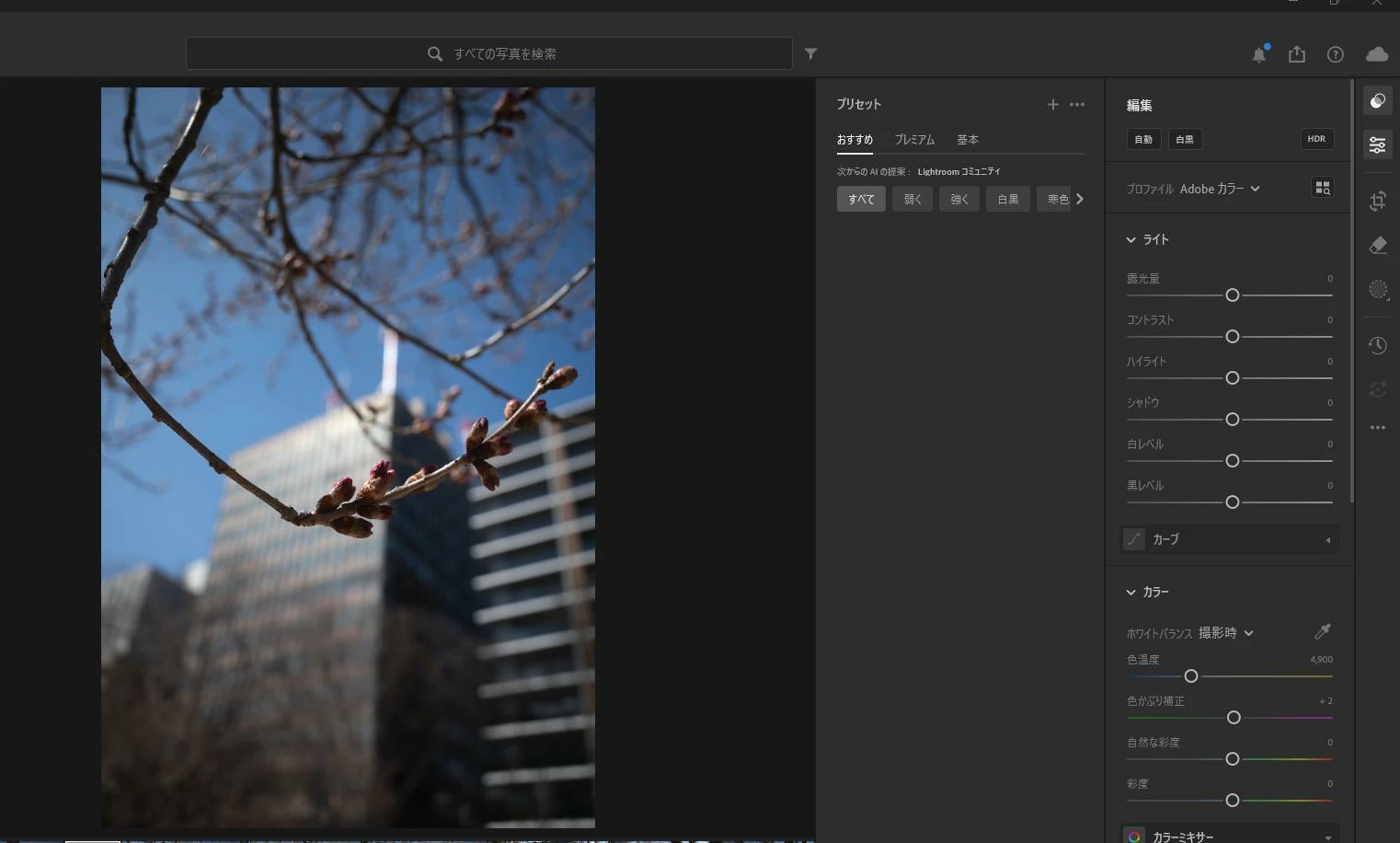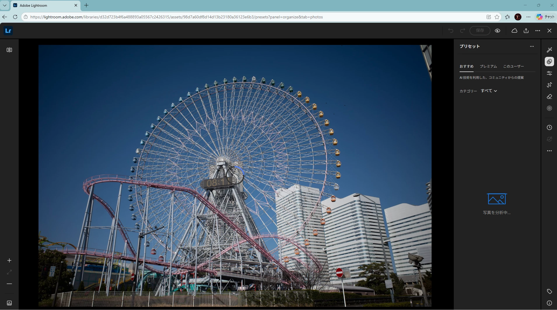 • Web 版の Lightroom では プリセットボタンを押し、画像解析中のアイコンが表示された後、おすすめプリセットの候補が表示される.