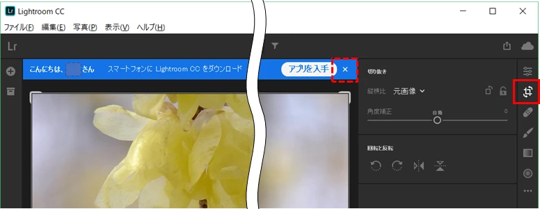 lightroomCCの画面に青色のバーで,「スマートフォンにLightroomCCをダウンロード」という表示があるのですが編集タブでバーの右側が少し隠れてしまっているせいで,消すことができません。おそらく隠れているところに消すマークがあるのではと思うのですが。バーを消すにはどうすればいいですか?ちなみにPC側の解像度などかえてみましたがだめでした。良い方法ありましたら教えてください。