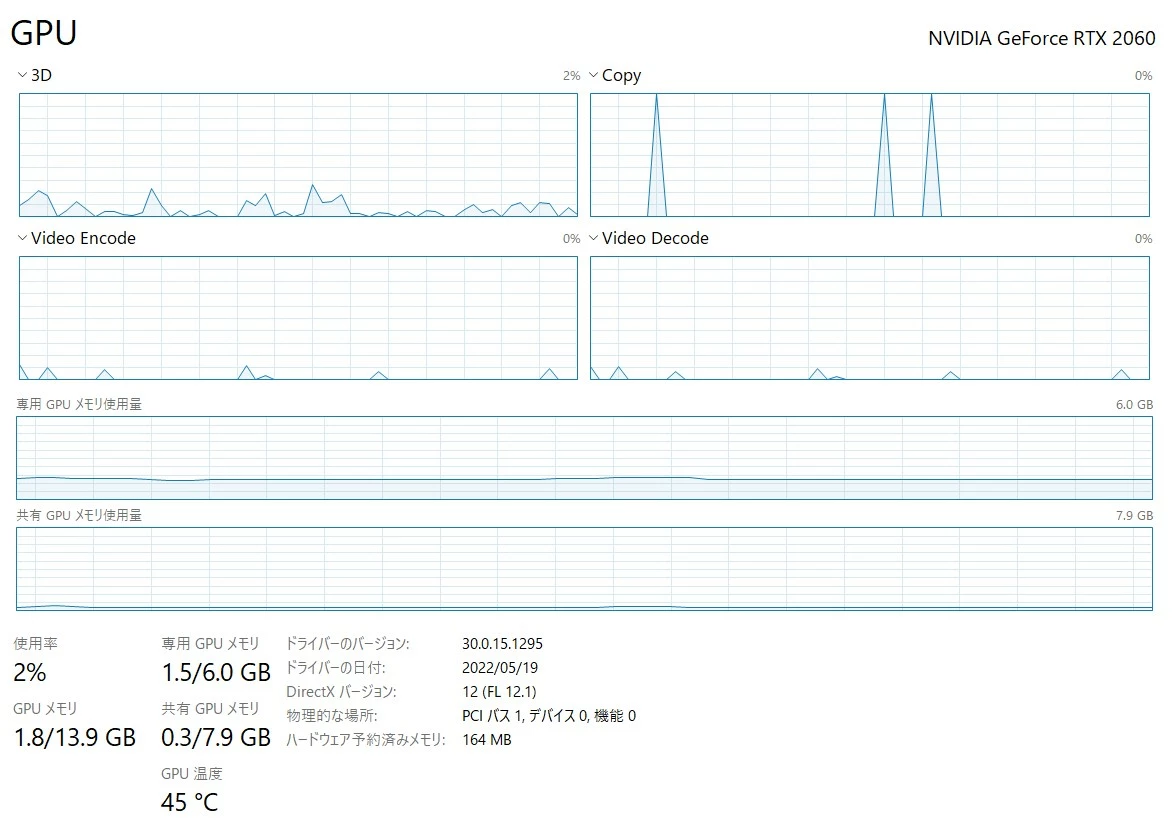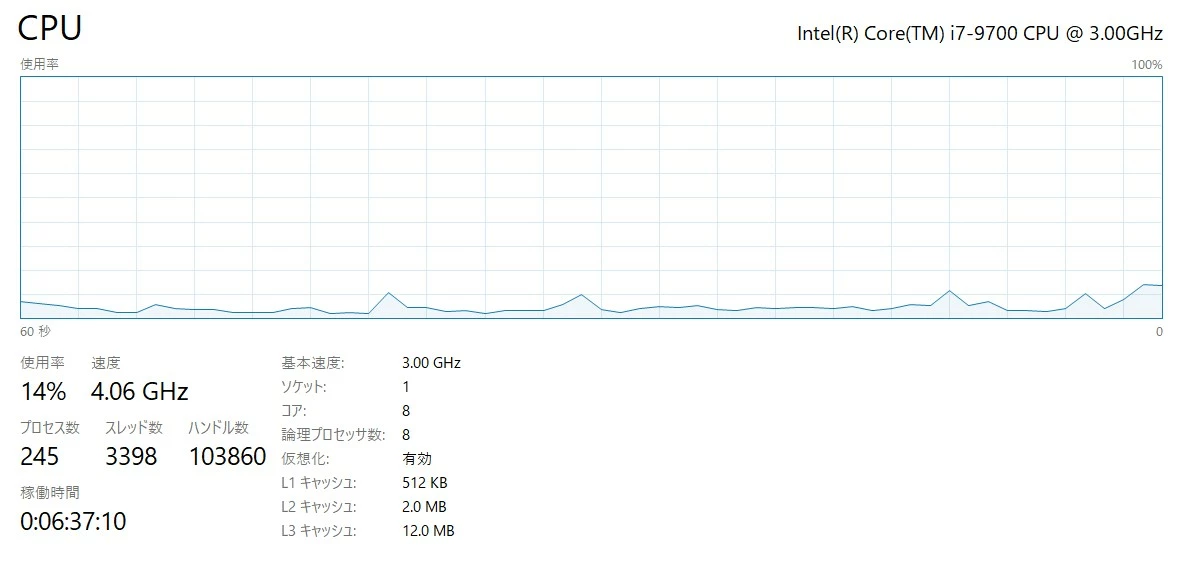 タスクマネージャーで状況を見ると処理開始直後はCPUが10%ほど処理していますが、数秒程度で1%以下にまで処理が落ちてしまいます。