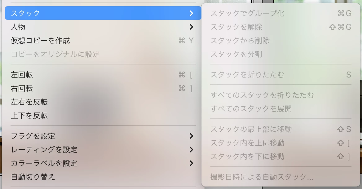 また、メニューバーの写真メニューにはスタックがありますが、その中の項目は全て非活性で使えない状態になっています。(写真1枚目)
