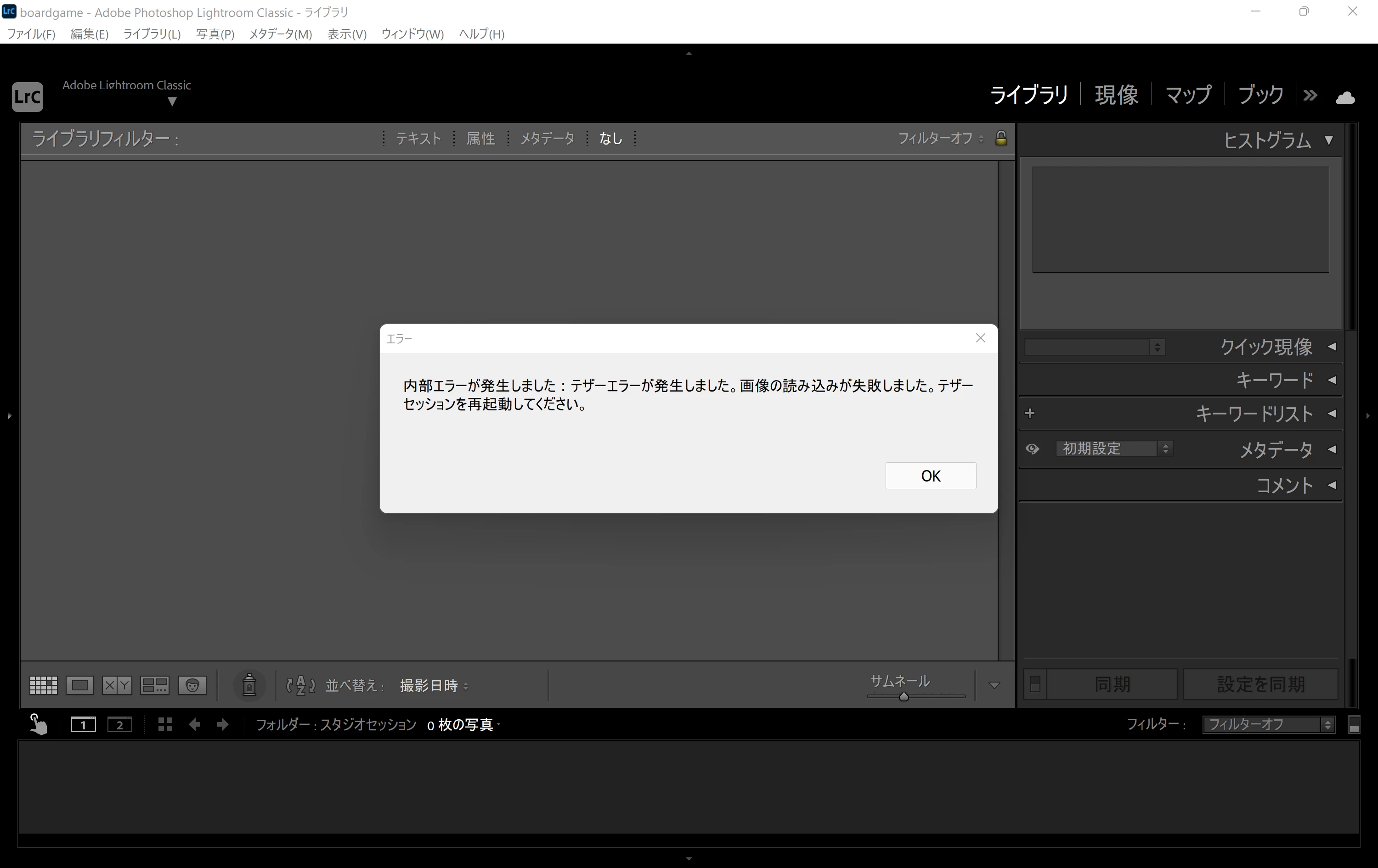 症状:テザー撮影でシャッターを切ると以下のエラーが表示されてLightroomに画像が読み込まれずにテザー撮影が停止します。