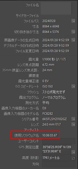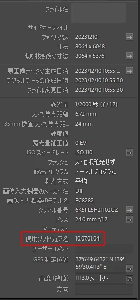 ②奇妙なことに、同じドローンで撮影した写真でも、ある時期より前(古い)ものについては正常動作します。大丈夫なファイルとダメなファイルを比較すると、添付写真のように「使用ソフトウェア名」のバージョン番号が異なります。