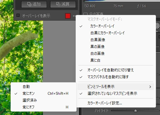 線形グラデーションや円形グラデーションマスクで、マスクの大きさや位置およびグラデーションの範囲を調整するための補助線が表示されなくなりました。表示が消えた原因と表示させるための方法を教えてください。