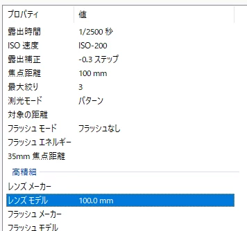 トキナーの100mmをR6で撮影して、Windowsのプロパティで表示して見ると、レンズモデルが焦点距離だけ表示されていました。