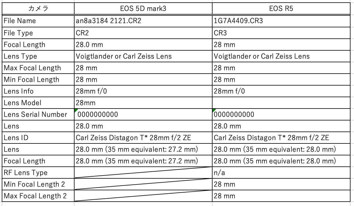 早速の回答ありがとうございます。ご指摘のとおりEF-RFマウント変換アダプタを使用しているのでその点は怪しいかもしれませんね。ただExifToolReaderで画像ファイルのExif情報を見比べてみるとEOS 5D mark3とEOS R5で特に違うように見えませんし「現像/レンズ補正/レンズプロファイル」ではEOS R5でも正しく「Zeiss Distagon T* 2/28 ZE」と表示されていてプロファイル補正もできるのでメタデータの表示の問題ではないかと思います。ExifToolReaderで読んだExifデータのうちレンズ関係の物をまとめた表を添付しておきます。何か良い知恵があればご教示いただけると助かります。