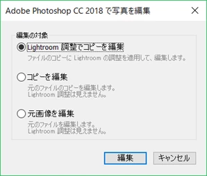 「他のツールで編集」→「Adobe Photoshop CC2018で編集」を選択すると、「Adobe Photoshop CC2018で写真を編集」ウィンドウが開きます。